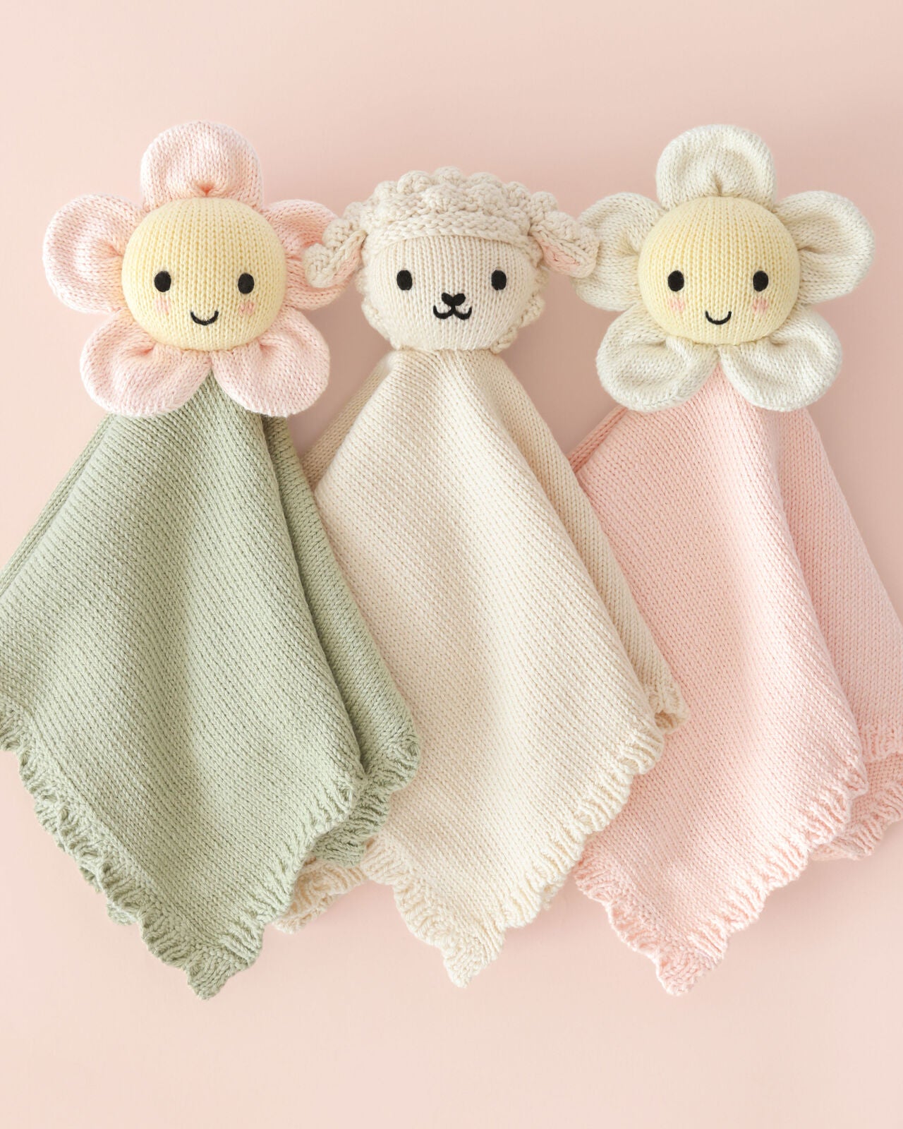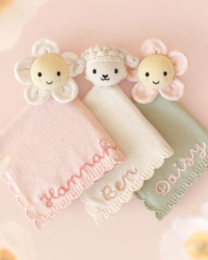 Beautifully hand-knit and luxuriously soft, our heirloom-quality loveys are designed to comfort your little one from day one. Each one is handcrafted from 100% organic cotton and finished with delicate scalloped trim and sweet hand-embroidered details that coordinate perfectly with our beloved baby animal collection.